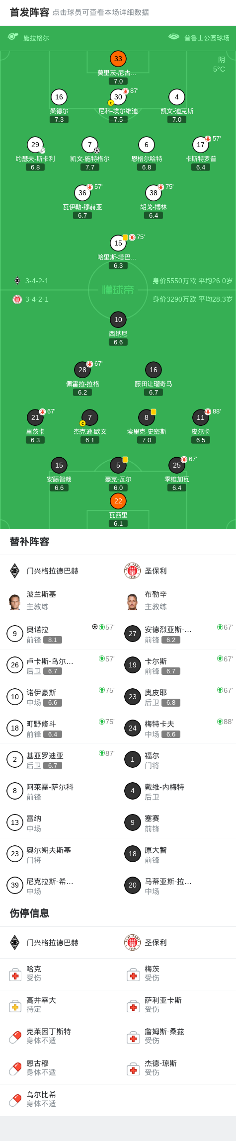 北京时间3月14日德国足球顶级联赛 联赛 第26轮,门兴格拉德巴赫主场对阵圣保利。门兴格拉德巴赫凯文-施特格尔破门,奥诺拉破门。最终比分门兴格拉德巴赫 2-0 圣保利。