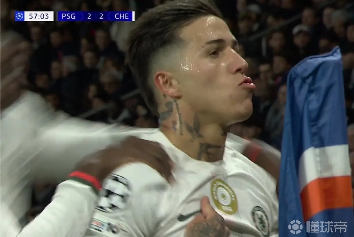 在对阵巴黎的欧冠1/8淘汰赛首回合比赛中,恩佐帮助切尔西扳平比分,他在进球后被拍到手指球衣上的世俱杯金标。